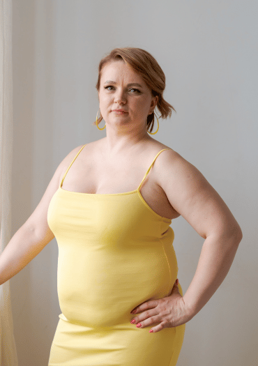 Avoid if possible: Bulky belts that sit at your natural waist or tops with clingy fabric around your midsection. Instead, pick garments that glide over the stomach and focus on your legs and neckline.