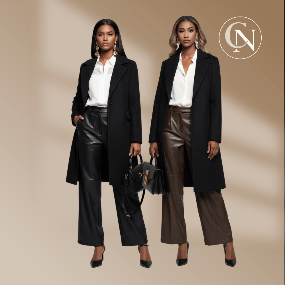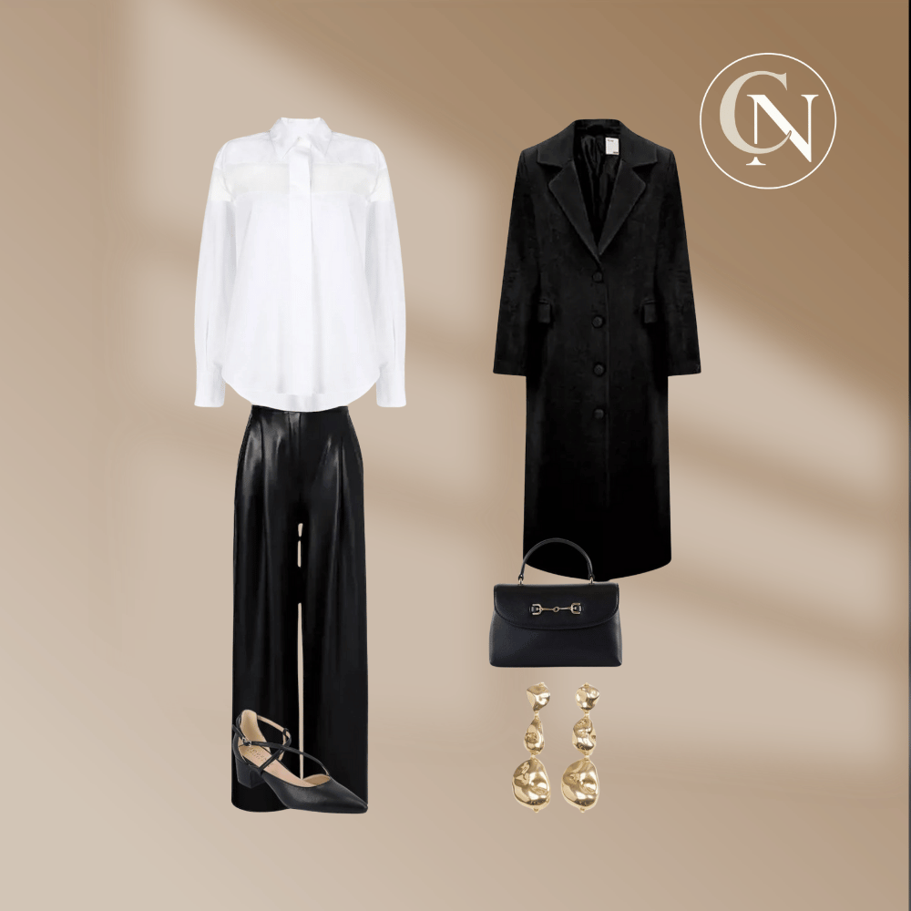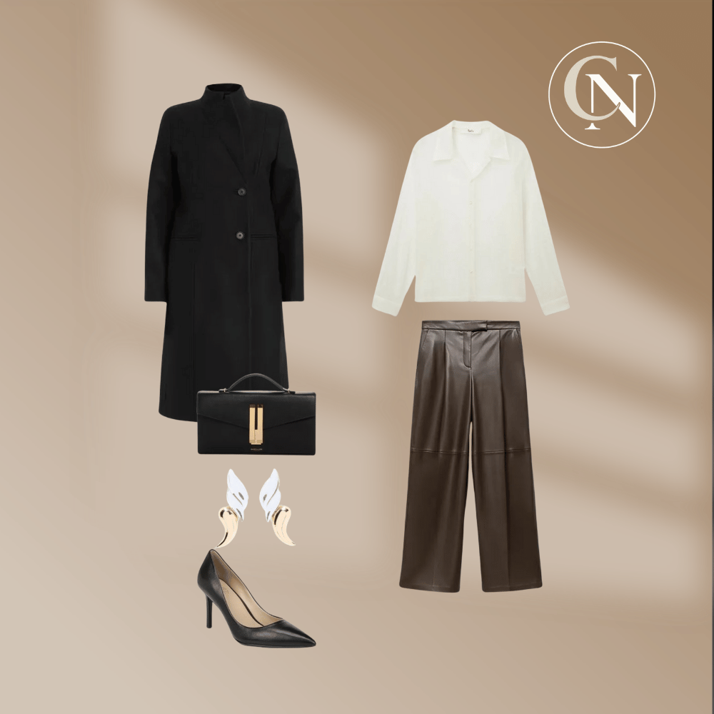 A black coat, a crisp white blouse, and wide-leg leather trousers… it’s the simplest way to look instantly put-together. Whether you’re a black-on-black queen or you love the warmth of deep chocolate, both outfits give effortless quiet luxury. ✨ Tap to shop the full look