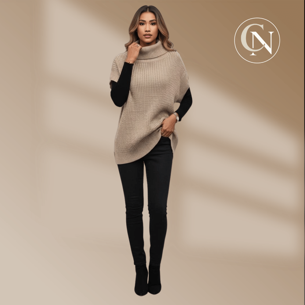 A neutral turtleneck poncho layered over classic black skinnies — the kind of effortless, elevated style that feels polished and comfortable. Perfect for errands, coffee dates, or a relaxed workday look.