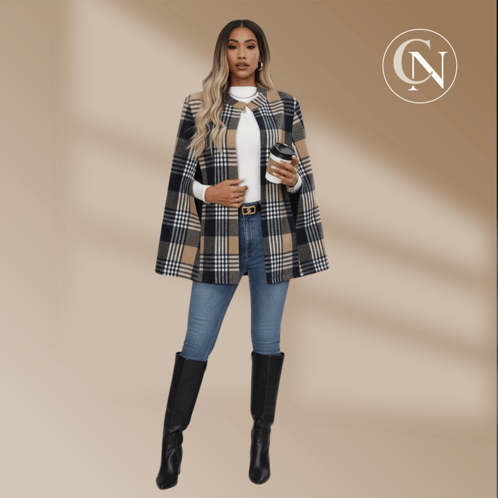 This classic plaid cape paired with denim and knee-high boots is the perfect blend of chic and effortless. An elevated everyday look you can wear from coffee runs to casual meetings.
