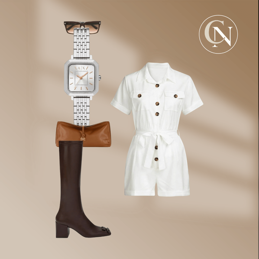Effortless, polished, and perfect for warm fall days — this crisp white utility romper paired with rich brown knee-high boots is the definition of chic minimal style. The structured mini barrel bag adds the perfect touch of elegance. Tap to shop this clean, modern neutral look.